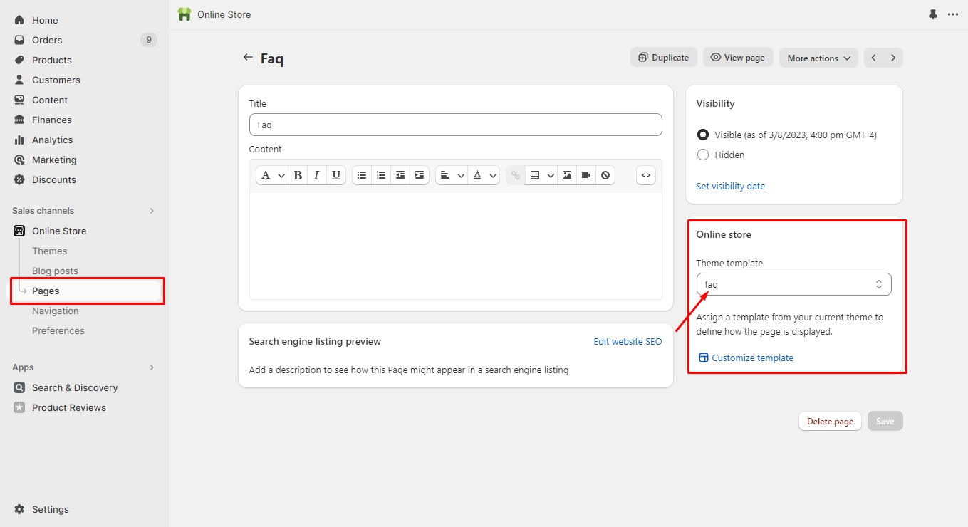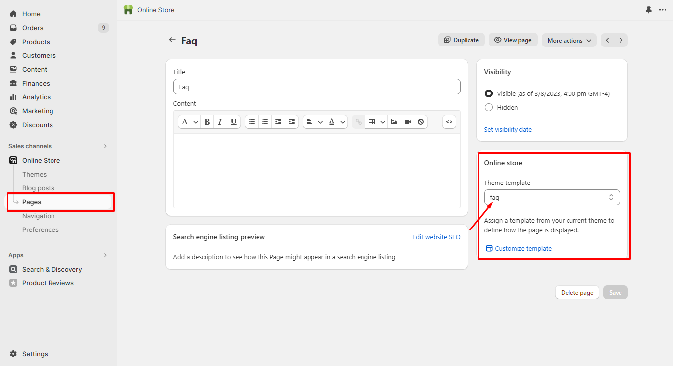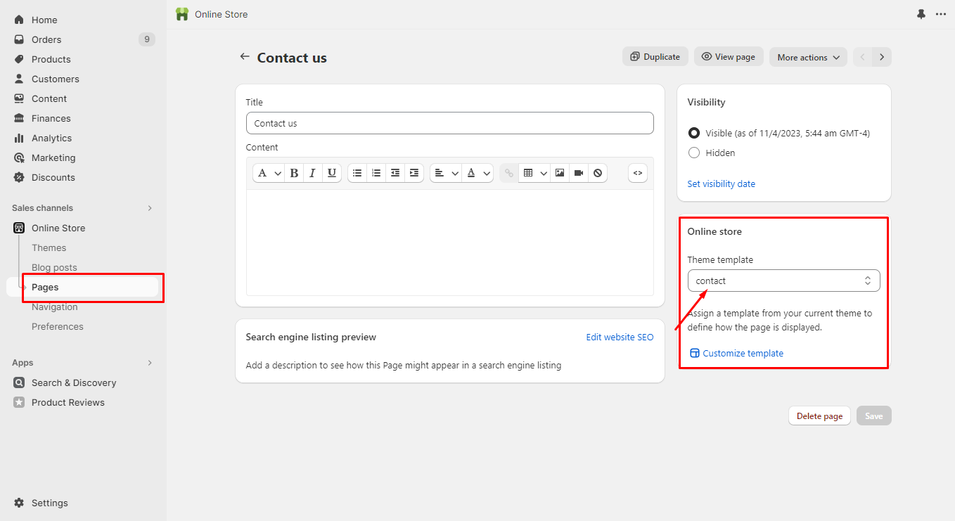 Under Visibility, select when you want to publish the page. By default, your new webpage will be visible when you click Save. Select the Hidden option if you want your new webpage to be hidden from your online store, or click Set a specific publish date to control when your webpage is published.