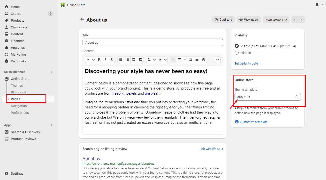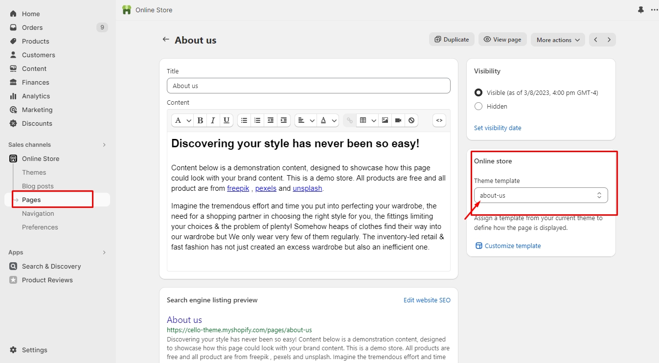 To add an About us or our store Page, Select Aboutus in the Theme Template dropdown.